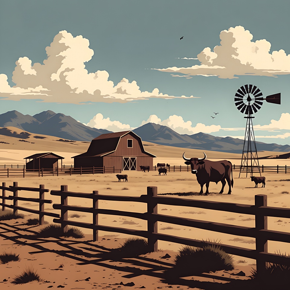 agriculture, barn, birds, bull, cattle, clouds, cow, farm, fence, field, grass, isolated background, landscape, livestock, mountains, pasture, ranch, red barn, rural, sky, western, windmill, wooden fence, illustration