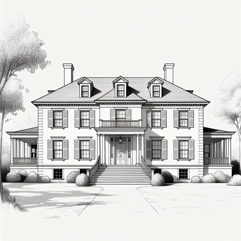 architecture drawing, black and white, chimneys, clipart, columns, driveway, front porch, gabled roof, grand house, house illustration, illustration, isolated background, line art, mansion sketch, shrubs, shuttered windows, trees, two-story home, colonial mansion