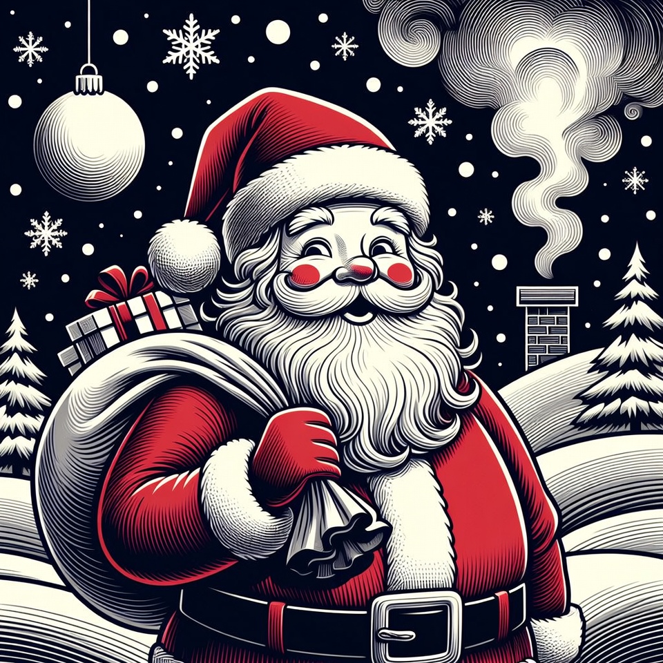 An illustration of Santa Claus stands on a snowy hill at night, holding a large sack with gifts over his shoulder. He wears a red suit, hat with white pom-pom, black boots, and has a long white beard and rosy cheeks. Snowflakes, Christmas ornaments, pine trees, and a chimney with smoke fill the dark starry background.