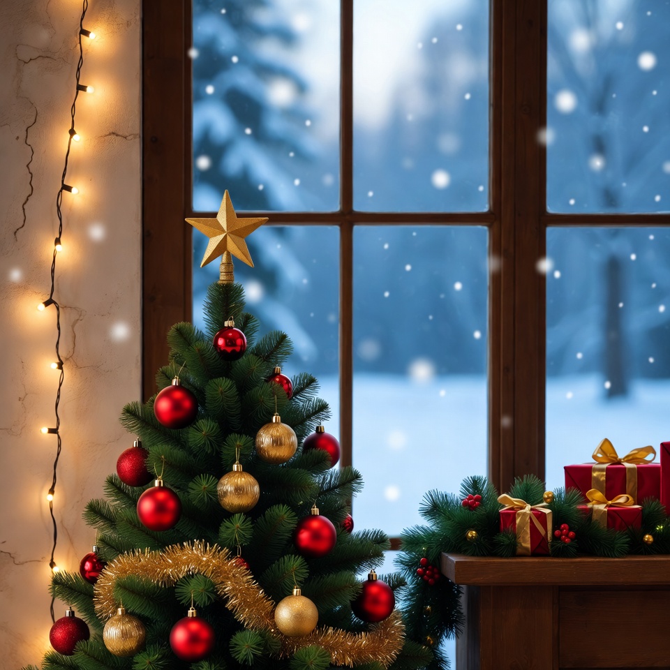 A decorated Christmas tree stands in a cozy room next to a large window with falling snow and pine trees outside. The tree is adorned with red and gold ornaments, a golden star topper, and golden garland. Gift boxes in red and gold sit on a wooden table beside the tree, illuminated by string lights on the wall.