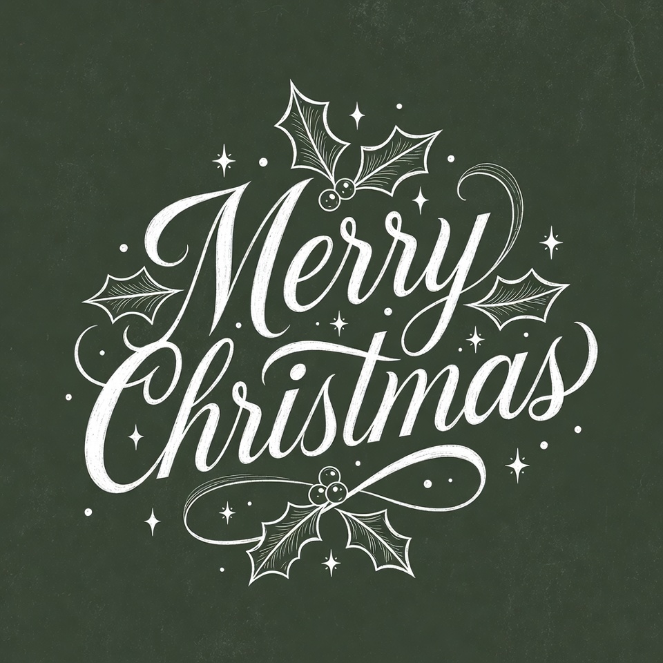 Christmas card, Christmas decor, Christmas greeting, chalkboard style, dark green, elegant script, festive text, green background, holiday design, holly branches, holly leaves, illustration, red berries, sparkles, stars, textured background, white ink, white text, winter holiday, Merry Christmas