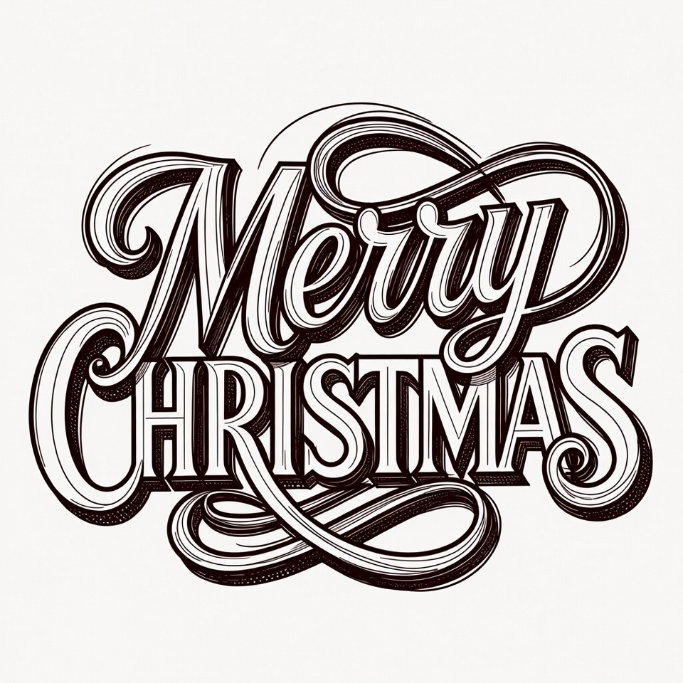Christmas, Christmas text, black ink, calligraphy, clipart, elegant design, festive text, greeting card, hand drawn, holiday greeting, illustration, isolated background, line art, ornate letters, script font, swirling flourishes, typography, vector art, Merry Christmas