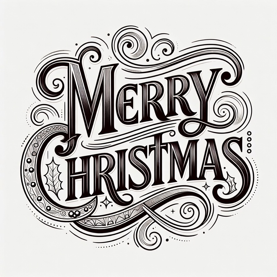 Elegant black ink illustration of 'Merry Christmas' text in ornate script lettering. Swirling flourishes, holly leaves, and decorative dots surround the words on a white background. The design features intricate line art with holiday motifs.