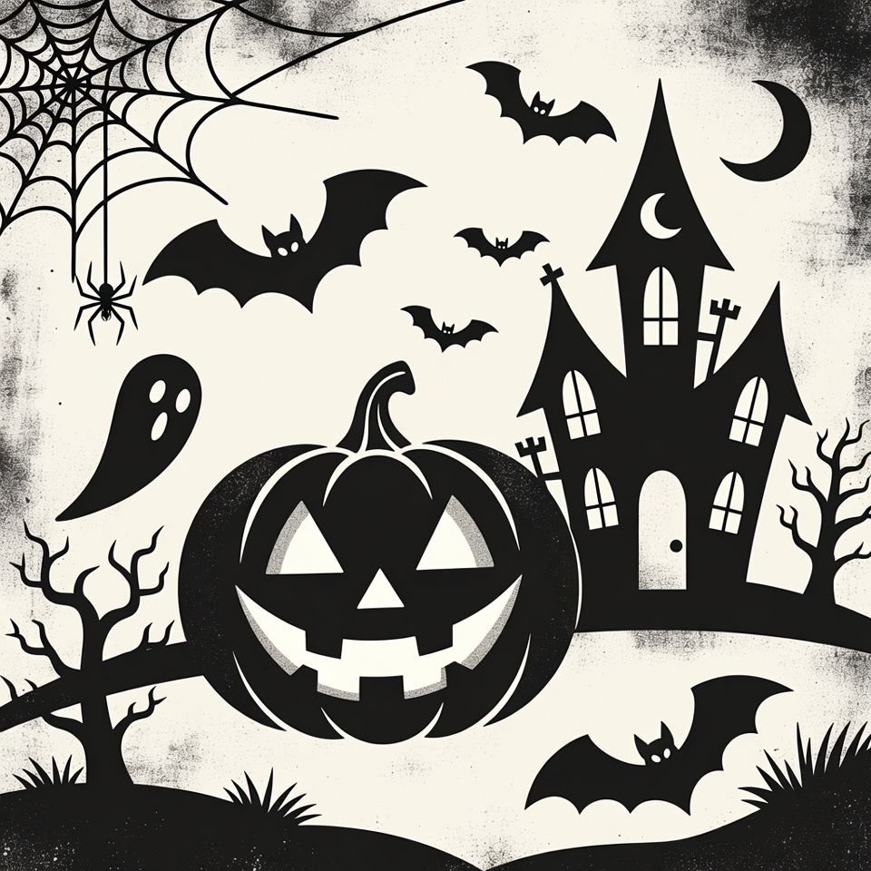 Halloween scene, bats, black white, cartoon Halloween, carved pumpkin, clipart, crescent moon, flying bats, ghost, ghosts, haunted castle, haunted house, illustration, isolated background, jack o lantern, jack-o-lantern, night sky, pumpkin, pumpkin face, scary house, silhouette, spider webs, spiders, spooky, textured background, Halloween