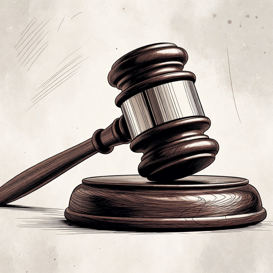 A detailed sketch illustration of a wooden gavel resting on its matching sounding block. The gavel features a polished brown handle and a striped head, rendered in a sepia-toned artistic style. The image is set against a textured, isolated beige background.