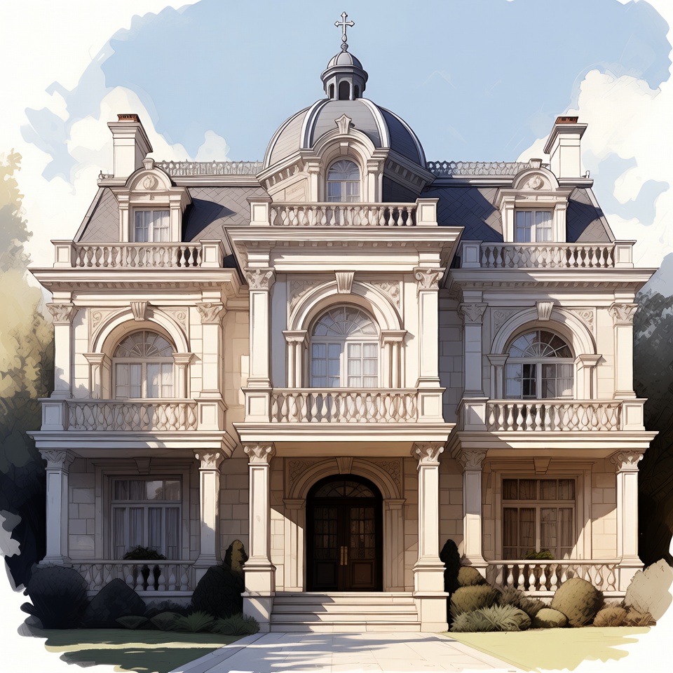 French chateau, arched windows, architecture, balcony, balustrade, beige building, blue sky, clouds, columns, cross, dome, driveway, elegant architecture, estate, exterior view, grand entrance, house, illustration, luxury home, ornate design, residence, shrubs, stone facade, symmetrical, watercolor style, mansion