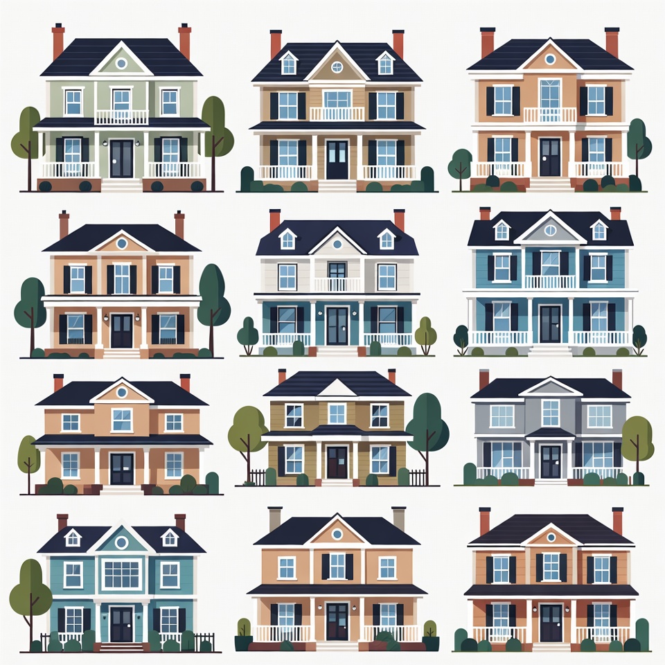 A grid of nine colorful clipart houses in various styles and colors, each with trees and shrubs nearby. The houses feature gabled roofs, front porches, and windows on an isolated white background. They showcase different shades like beige, blue, gray, and orange.