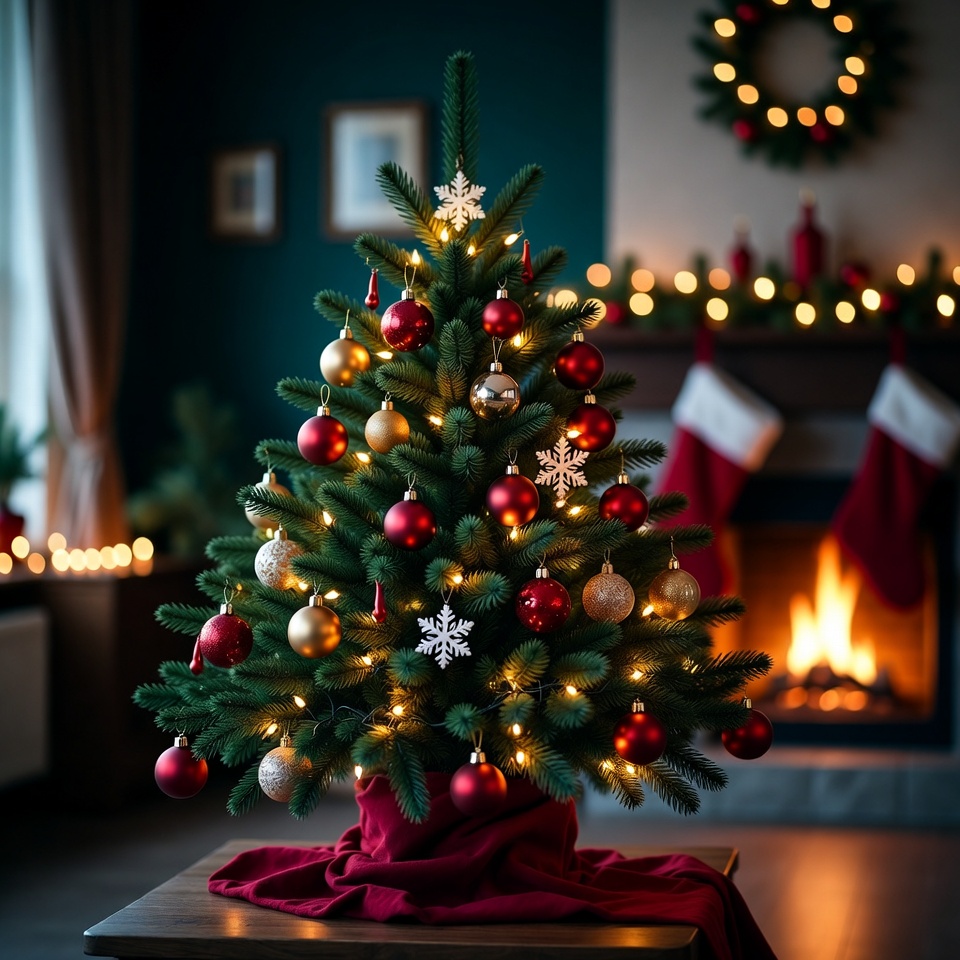 A small decorated Christmas tree with red, gold, and silver ornaments, snowflakes, and lights stands on a wooden table covered with a red cloth. It is placed in a cozy living room with a lit fireplace, white stockings hanging on the mantel, and a Christmas wreath on the wall. Teal walls, candles, and garlands add to the festive holiday decor.
