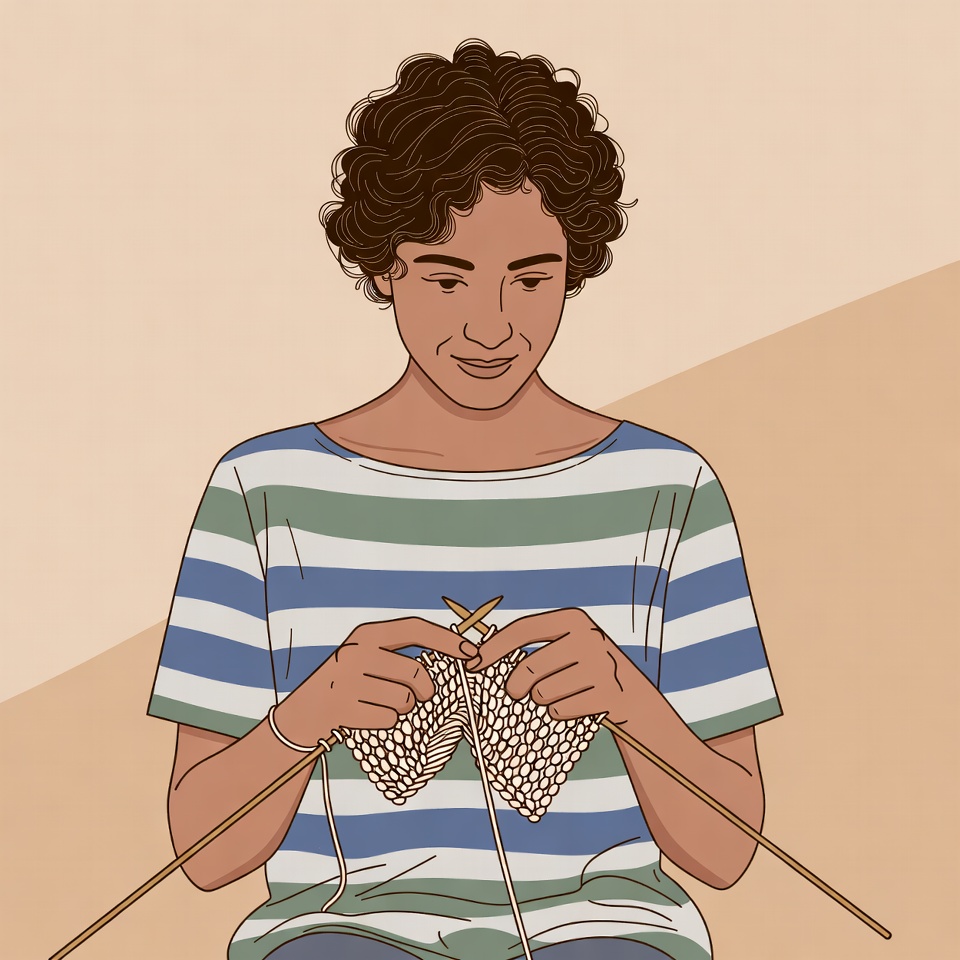 An illustration of a woman with curly brown hair knitting yarn with needles. She wears a green and white striped shirt and sits against a beige background. Her hands hold the knitting needles and partially completed knitted piece.