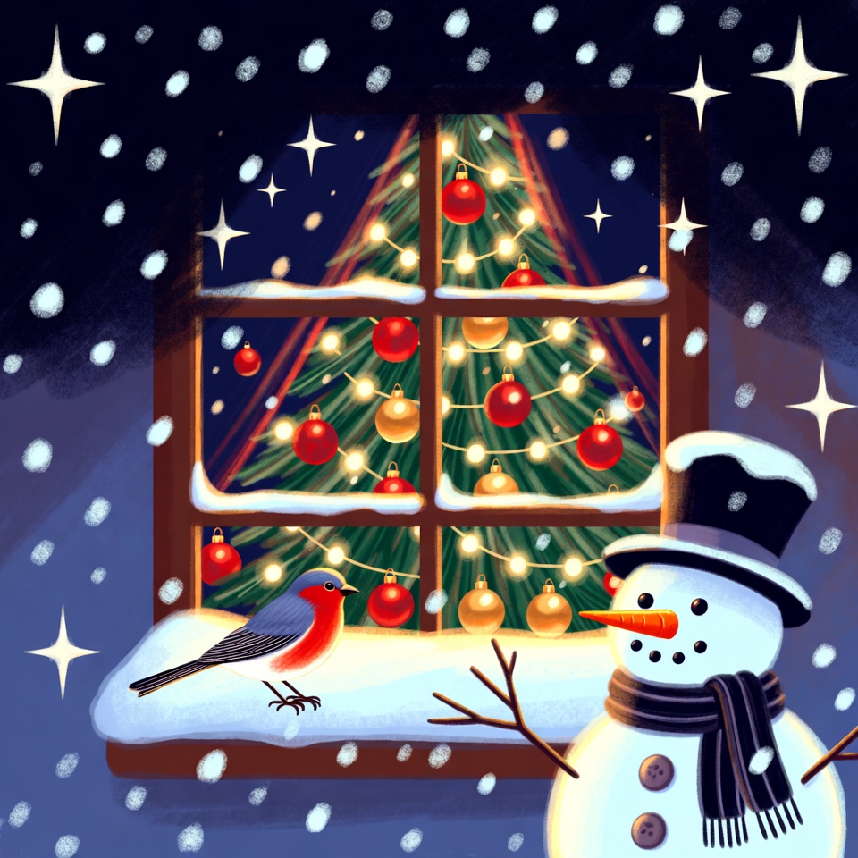 A cheerful snowman with a black hat, carrot nose, and scarf stands on a snowy windowsill next to a small red-breasted robin bird. Inside the window, a tall decorated Christmas tree glows with colorful lights, red and gold ornaments, and twinkling stars. Snowflakes fall gently outside against a dark night sky.