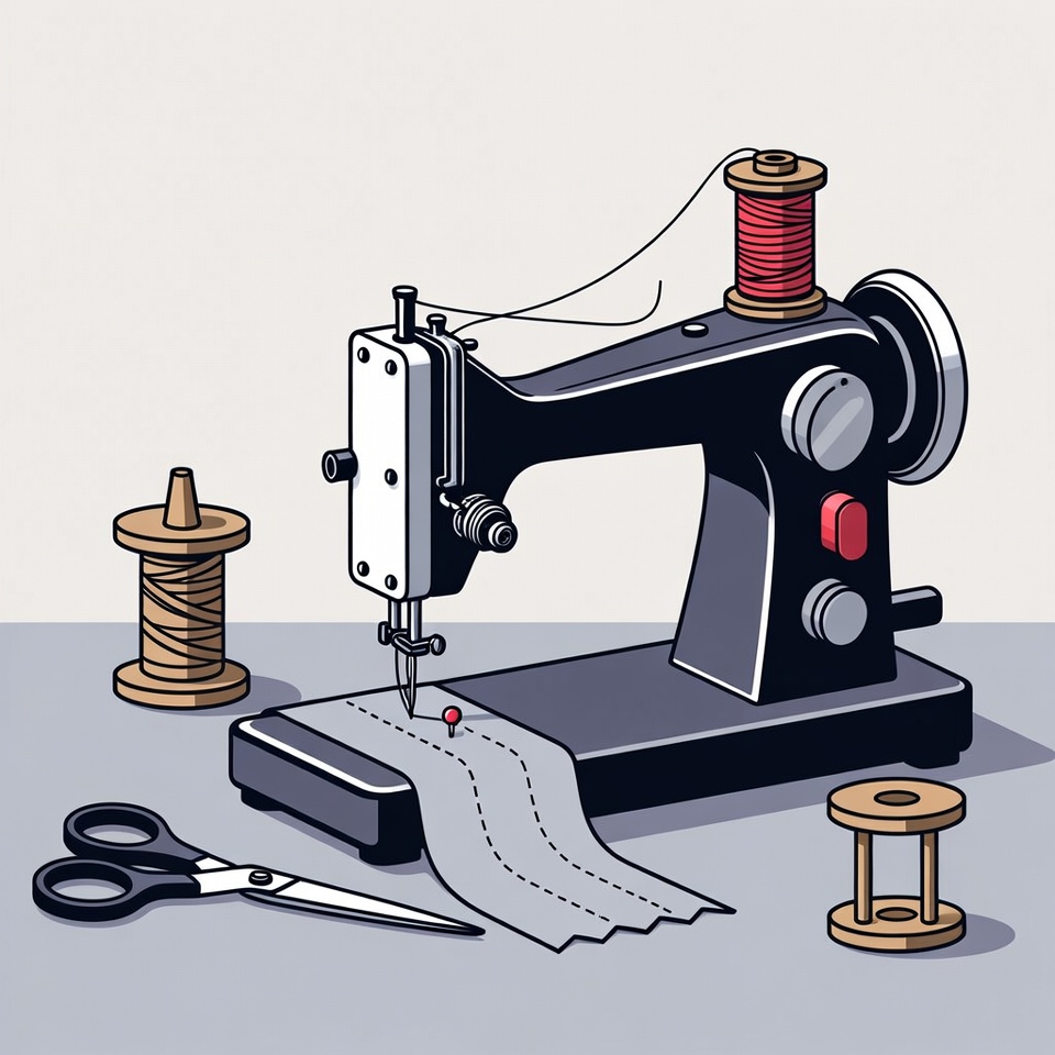 A black sewing machine with a needle piercing gray fabric sits on a flat surface. Wooden thread spools in red, beige, and other colors surround it, along with a pair of scissors. The scene is depicted in a clean line art illustration style on an isolated white background.