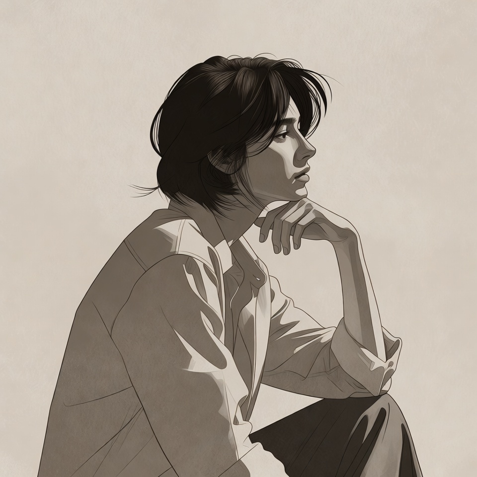 A young man with tousled black hair sits in profile view against a plain background. He wears a loose white shirt with rolled sleeves and rests his chin thoughtfully on his hand while sitting with knees drawn up. The image is rendered in a detailed digital illustration style with soft shading.