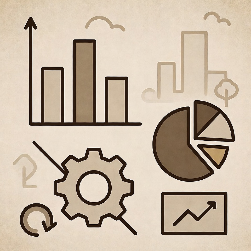 arrow up, bar graph, beige background, charts, cycle arrow, data visualization, financial symbols, gear, graphs, growth arrow, illustration, industry gear, line art, pie chart, segments, statistics, textured paper, upward trend, vintage style, business icons