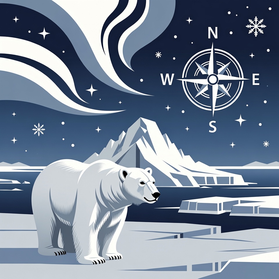 A white polar bear stands on an ice floe in a dark Arctic landscape with snow-capped mountains and icy waters in the background. Vibrant green and purple northern lights swirl across the starry night sky, accompanied by snowflakes. A large white compass rose with directional letters N, S, E, W is prominently featured in the upper sky.