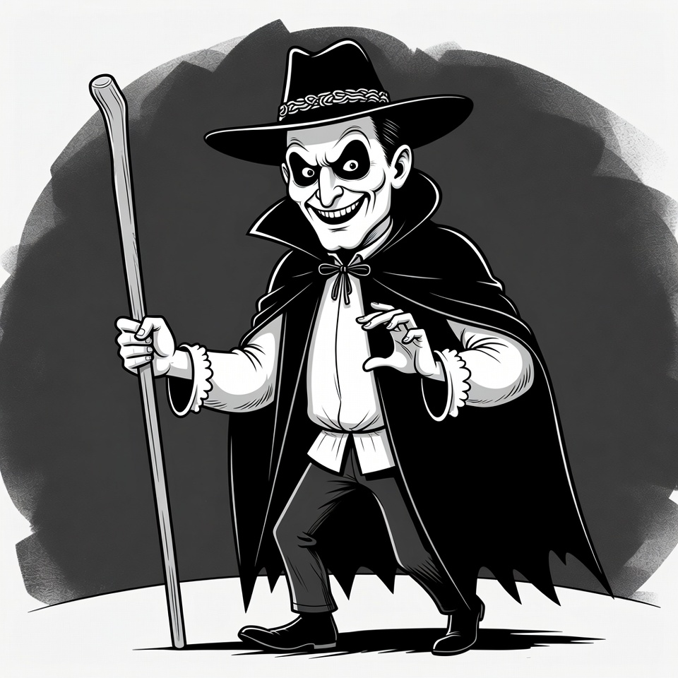 Halloween, black cape, black white, cartoon, claw hand, creepy illustration, dark cloak, dracula, evil grin, fantasy character, gothic man, grim reaper, horror figure, illustration, ink drawing, isolated background, man, menacing pose, ruffled shirt, spooky character, staff holder, vampire, white eyes, wide hat, wooden staff, sinister man