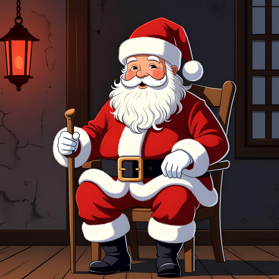 A cheerful cartoon Santa Claus with a white beard sits on a wooden chair holding a cane. He wears a red suit with white trim, black boots, and a red hat with a pom-pom. The scene is set against a dark rustic wall with a glowing lantern and wooden window.