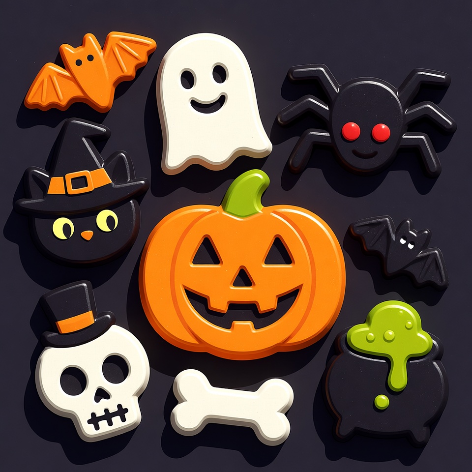 3D render, Halloween icons, bat, black cat, black spider, bone, cartoon, cauldron, clipart, ghost, green cauldron, illustration, isolated background, jack-o-lantern, orange pumpkin, pumpkin, skull, spider, white ghost, witch hat, Halloween