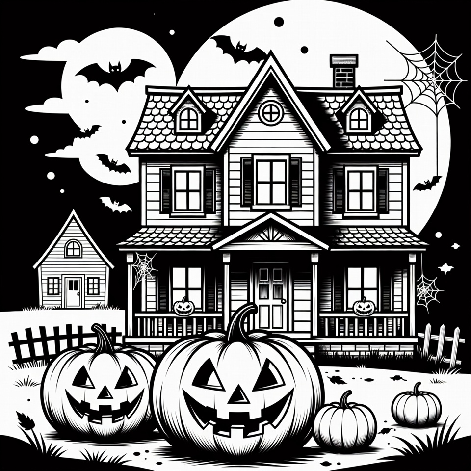A black and white illustration depicts a large haunted house with a moon, bats, and spider webs in the night sky. Carved jack-o'-lantern pumpkins with smiling faces sit in the foreground on the grass. A smaller house and wooden fence complete the spooky Halloween scene.