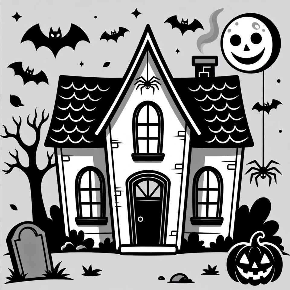 A black and white illustration depicts a tall haunted house with a pointed roof, surrounded by flying bats, spiders, and a grinning moon. A bare tree, pumpkin, and gravestone stand in the foreground on a gray background. Smoke rises from the chimney, and a web hangs near the windows.