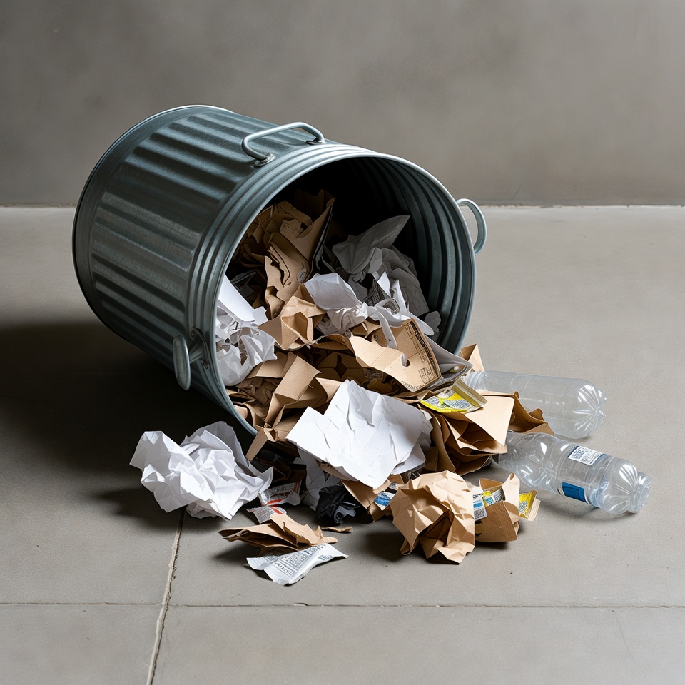 cardboard scraps, concrete floor, crumpled paper, debris, garbage bin, isolated background, litter, mess, metal bin, overflowing trash, plastic bottles, recycling, spilled garbage, waste, water bottle, trash can