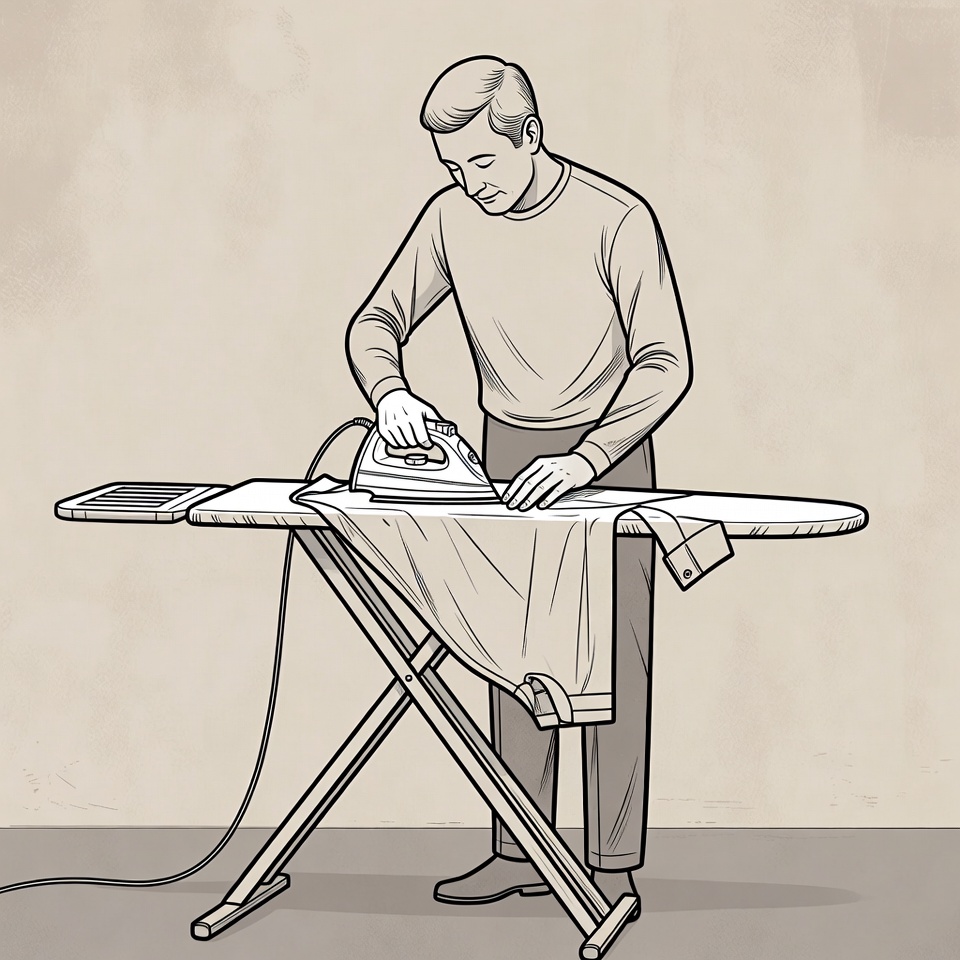 A man with short hair stands at an ironing board, pressing a white garment with a steam iron. He wears a long-sleeved sweater, pants, and shoes. The scene is depicted in a simple line drawing style on a beige background.