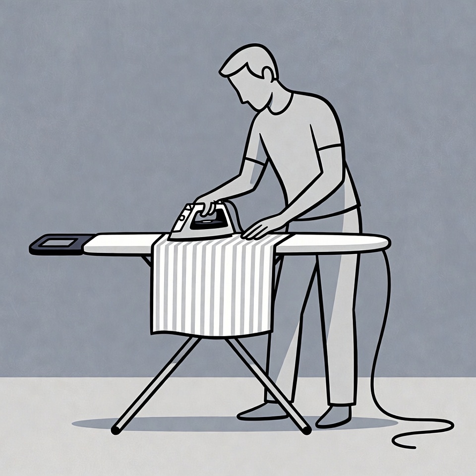 A line drawing illustration depicts a man ironing a striped shirt on an ironing board. He wears a t-shirt and pants, standing in front of the board with a steam iron in hand. The image is rendered in simple black line art on a light gray background.