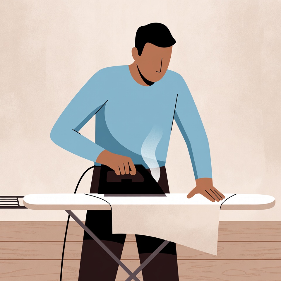 A Black man with short hair stands at an ironing board, pressing a white shirt with a steaming iron. He wears a light blue shirt and dark pants. The illustration features a simple beige background.