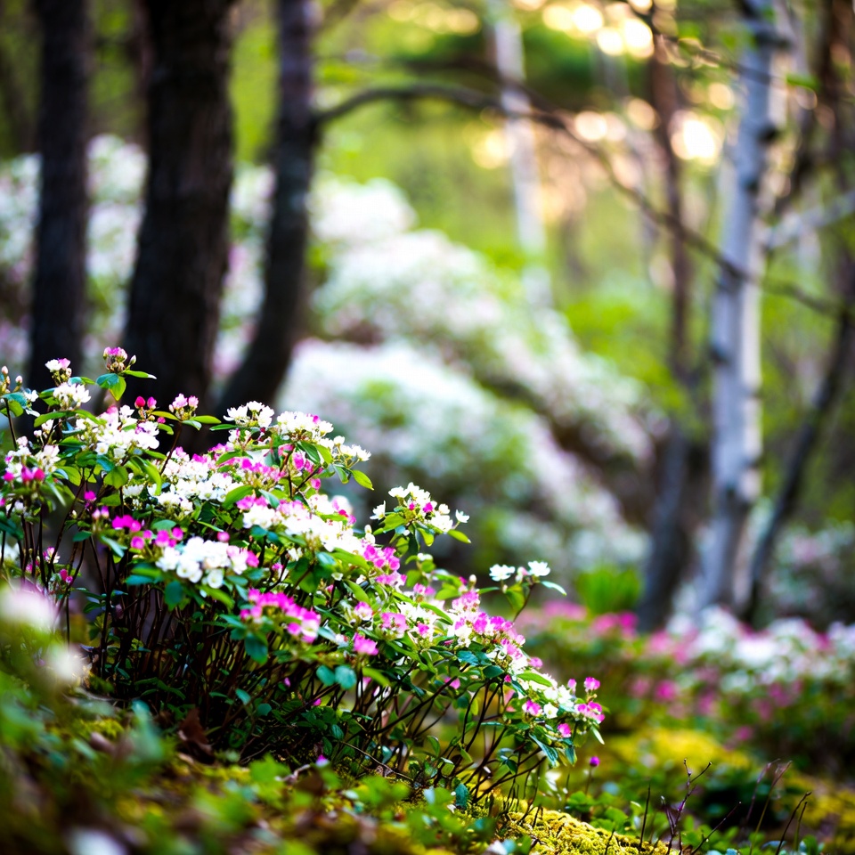 Close-up of pink and white flowers blooming among green leaves on the forest floor. Tall birch and evergreen trees surround the vibrant floral cluster in a lush woodland setting. Sunlight filters through the canopy, highlighting the delicate petals and mossy ground.