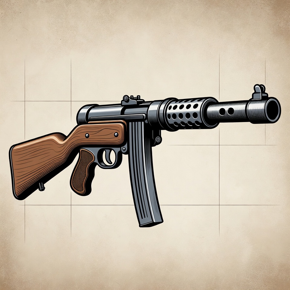 German gun, WWII weapon, barrel shroud, beige background, clipart, firearm, gun illustration, illustration, isolated background, machine gun, magazine, metallic gun, military weapon, pistol grip, side view, submachine gun, vector art, vintage gun, wooden stock, MP40