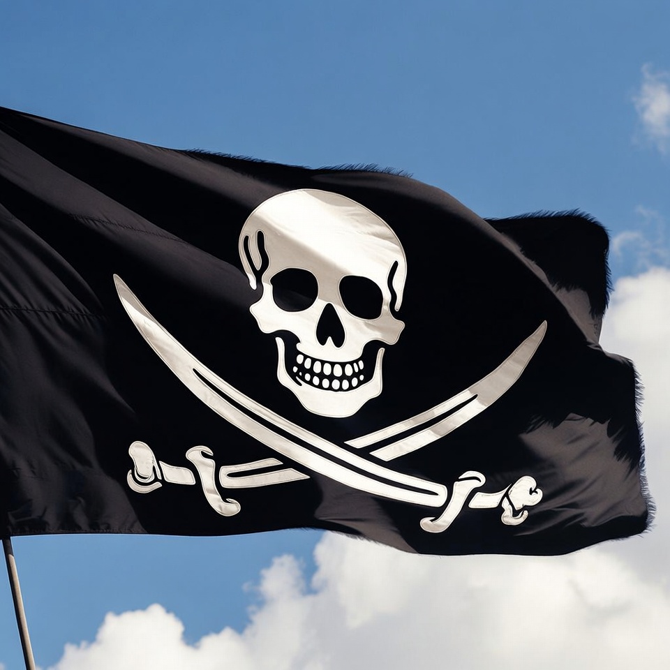 A black pirate flag with a white skull and crossed swords waves against a clear blue sky with scattered clouds. The skull features a grinning mouth and prominent eye sockets. The flag is attached to a pole and billows in the wind.