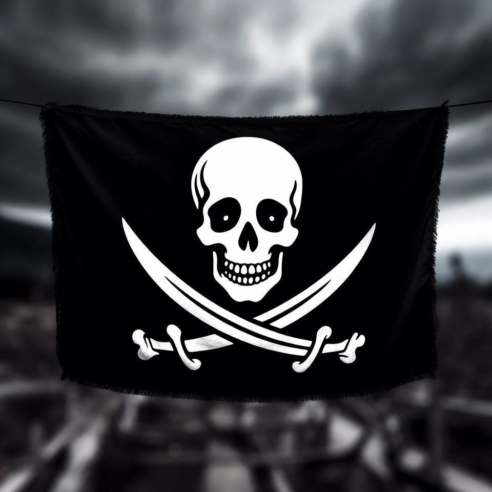A black pirate flag with a white skull and crossbones hangs against a dark, stormy background. The grinning skull features empty eye sockets and crossed swords beneath it. The flag has frayed edges and is draped as if waving in the wind.