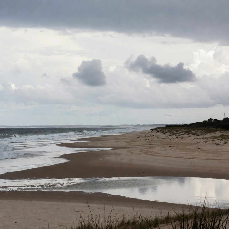 A wide sandy beach stretches along the turbulent ocean under a dark, cloudy sky. Gentle waves lap at the shore, forming shallow pools of water that reflect the overcast clouds. Tall grasses grow in the foreground near tire tracks on the wet sand.