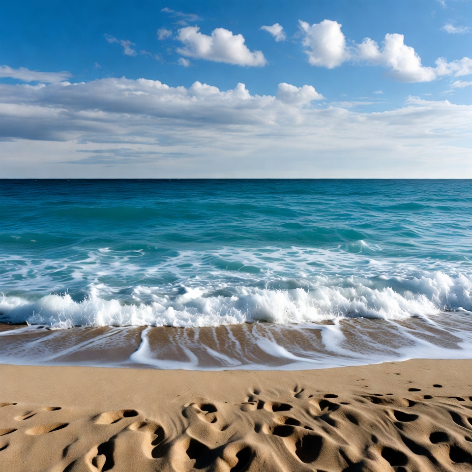 A serene beach scene features turquoise ocean waves crashing onto light beige sand. Fluffy white clouds dot the bright blue sky above the horizon. Footprints are visible in the wet sand near the foaming surf.