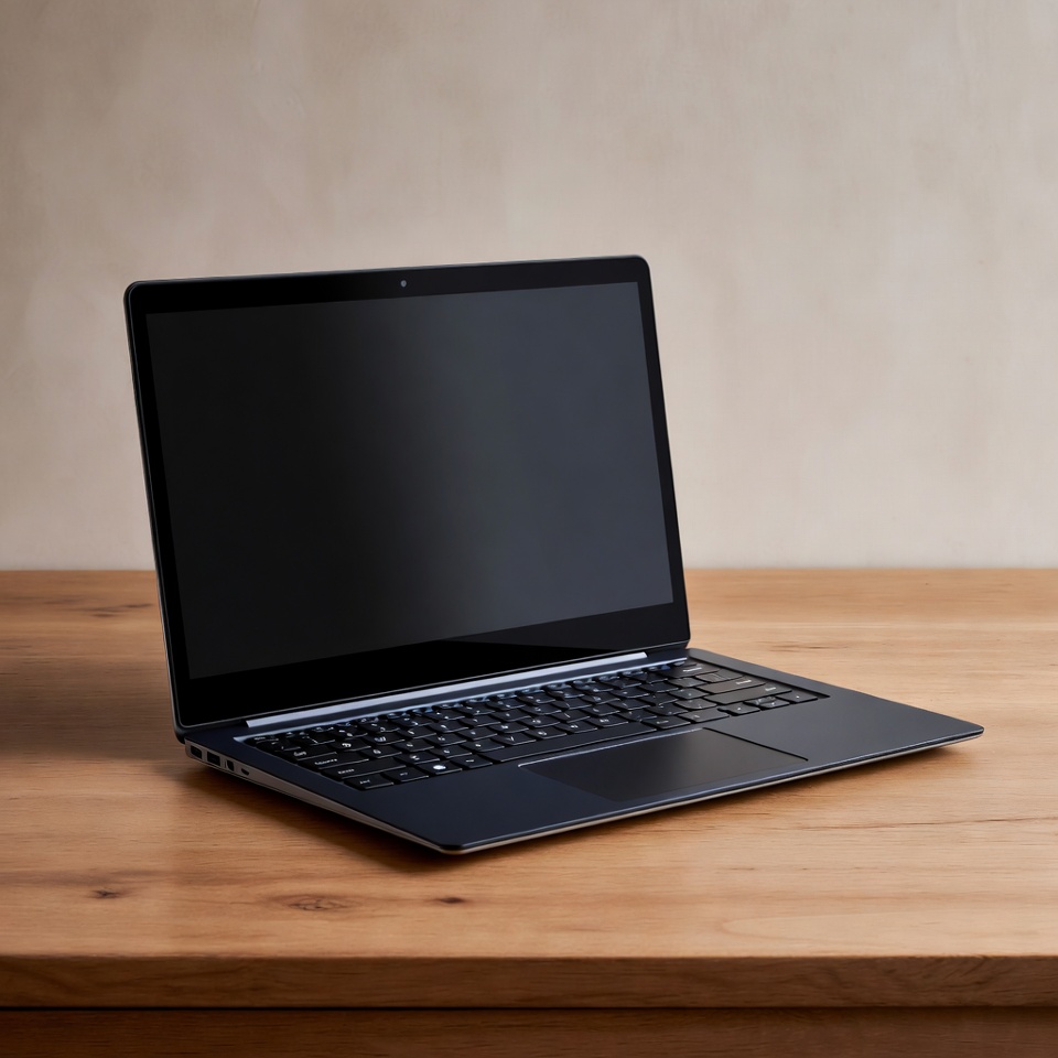 black laptop, computer, dark screen, isolated background, keyboard, modern laptop, notebook computer, office desk, screen, slim laptop, technology, trackpad, wooden table, laptop
