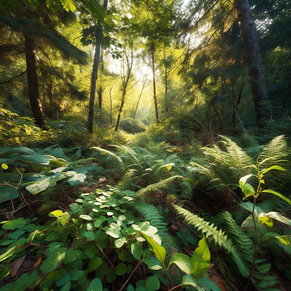 A dense forest features tall evergreen trees with sunlight filtering through the canopy, casting golden rays on the forest floor. Lush green ferns and undergrowth cover the ground, creating a vibrant woodland scene. Sunbeams illuminate the misty understory amid scattered branches and foliage.