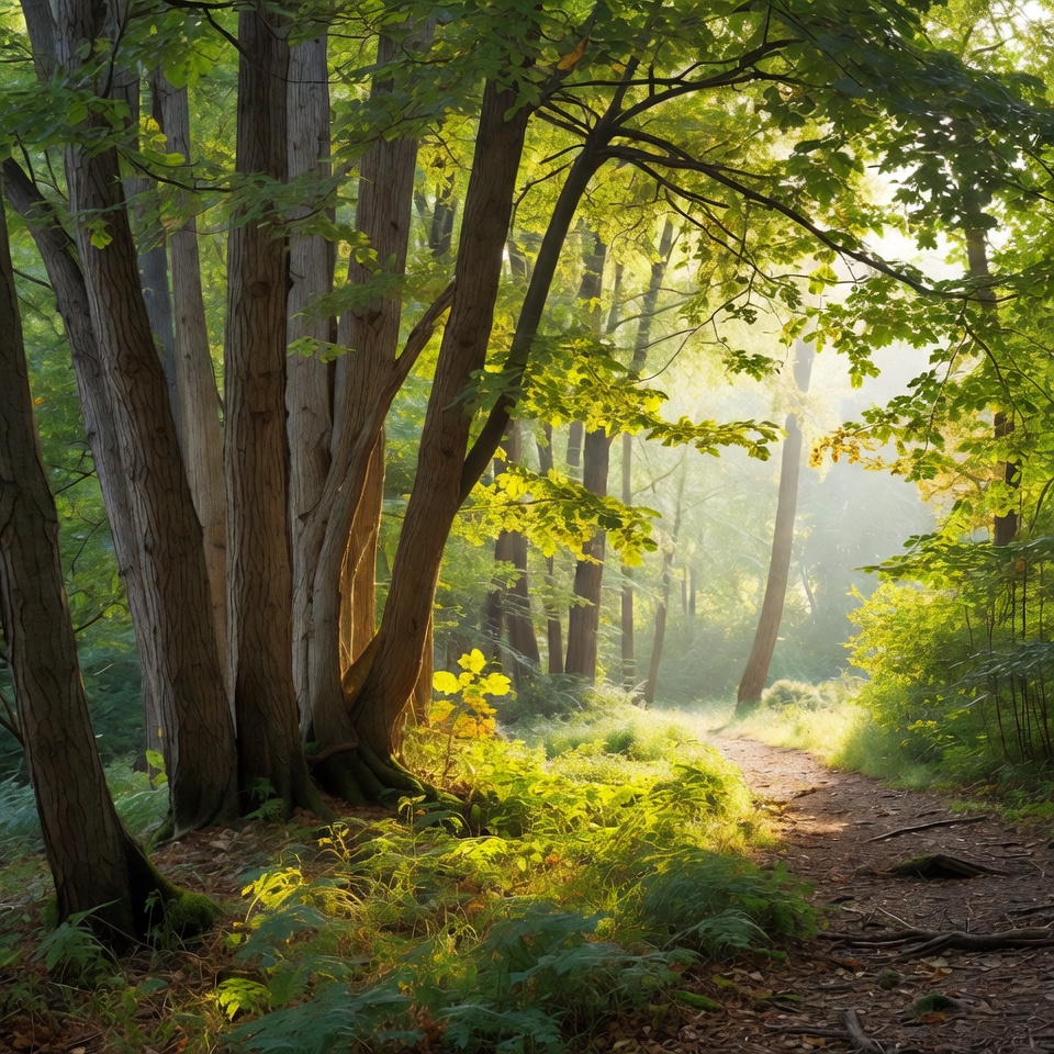 bark, canopy, dense forest, dirt path, ferns, foliage, forest path, golden light, green leaves, greenery, morning light, mossy ground, natural trail, nature, path, rays of light, serene forest, sunbeams, sunlight, tall trees, trail, tree trunks, trees, undergrowth, woodland, woods, forest