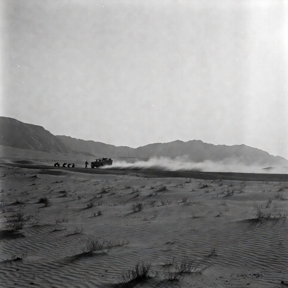A black and white photograph shows a military jeep driving through a vast sandy desert, kicking up dust behind it. Several soldiers stand nearby and beside the vehicle in a rugged mountainous landscape. Sparse desert vegetation dots the sandy terrain.