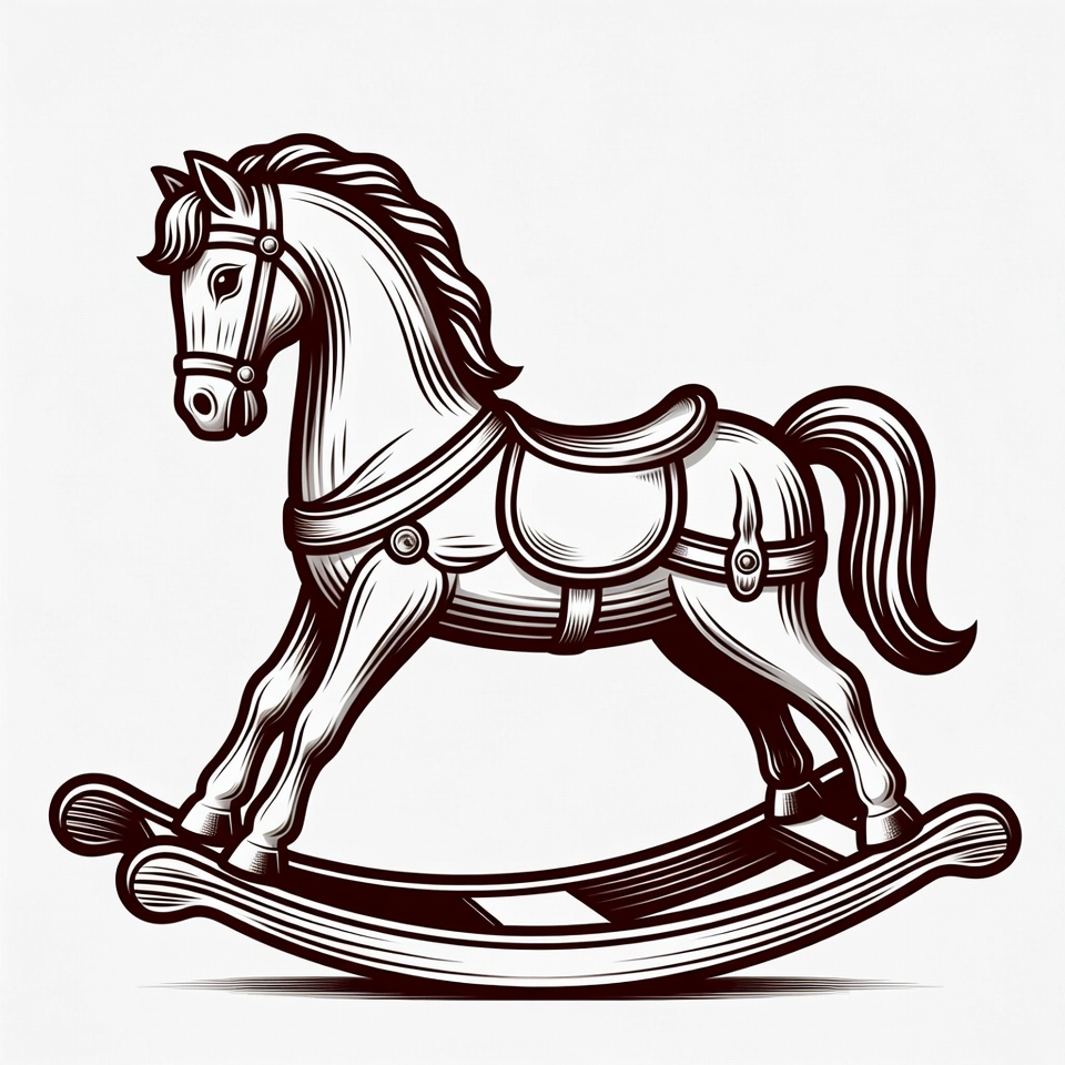 animal illustration, bridle, clipart, engraving, horse, illustration, isolated background, line art, mane, saddle, tail, toy, vector, white background, wooden rockers, rocking horse
