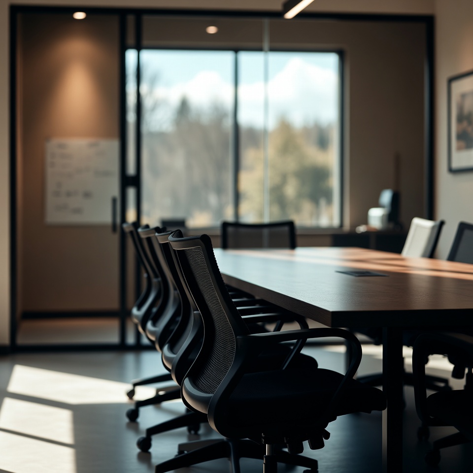 boardroom, business meeting, contemporary design, corporate space, empty room, framed art, glass doors, glass walls, interior design, large window, meeting room, mesh chairs, modern office, natural light, neutral walls, office chairs, office furniture, office interior, professional office, sunlight, trees outside, whiteboard, wooden table, workspace, conference room