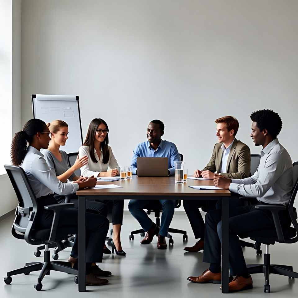 African-American, White, blazers, chairs, conference room, conference table, corporate, discussion, diverse team, glasses water, group meeting, laptop, men, modern office, notebooks, office, professionals, sitting, suits, team discussion, whiteboard, windows, women, wooden table, business meeting