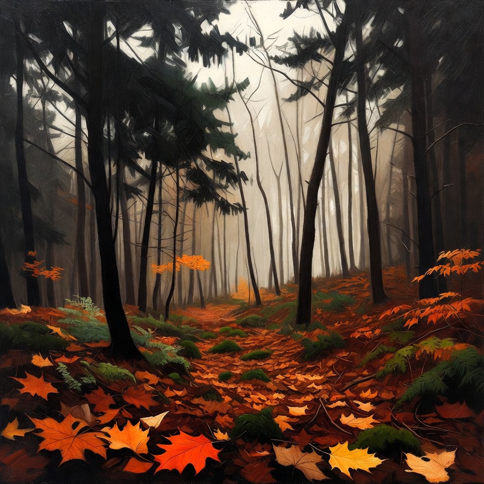 autumn scenery, dark trees, fall leaves, fog, foggy path, foggy woods, forest landscape, forest path, illustration, mist, misty atmosphere, moss ground, nature art, orange leaves, pine trees, pines, red leaves, tall pines, trees, woodland trail, autumn forest