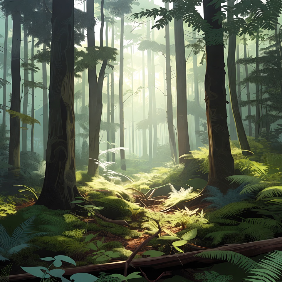 dense forest, digital art, ferns, forest floor, forest trail, glowing light, green foliage, illustration, landscape, lush greenery, misty woods, mossy path, natural path, nature, ray of light, serene woods, sunbeams, sunlight, tall trees, tree trunks, trees, undergrowth, vibrant forest, woods, forest