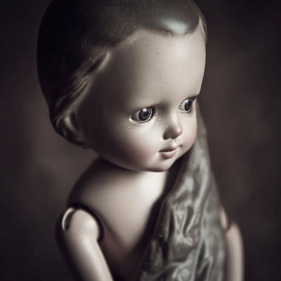 A porcelain doll with a bald head and large eyes stares sideways in sepia tone. It has visible joints on its arms and body, and a gray cloth is draped over its shoulder. The doll stands against a dark blurred background.