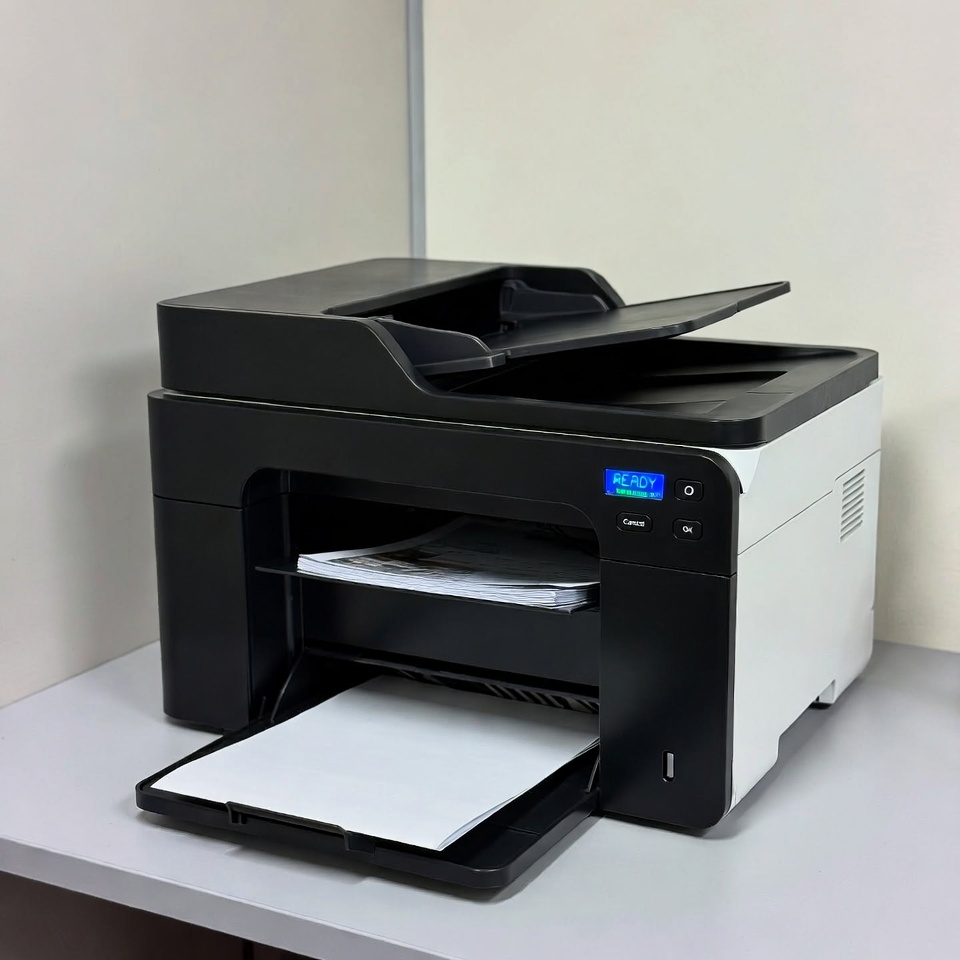 Canon, Canon printer, black printer, digital display, documents, electronics, laser printer, machine, office desk, office printer, open cover, output tray, printing device, printing paper, white paper, printer