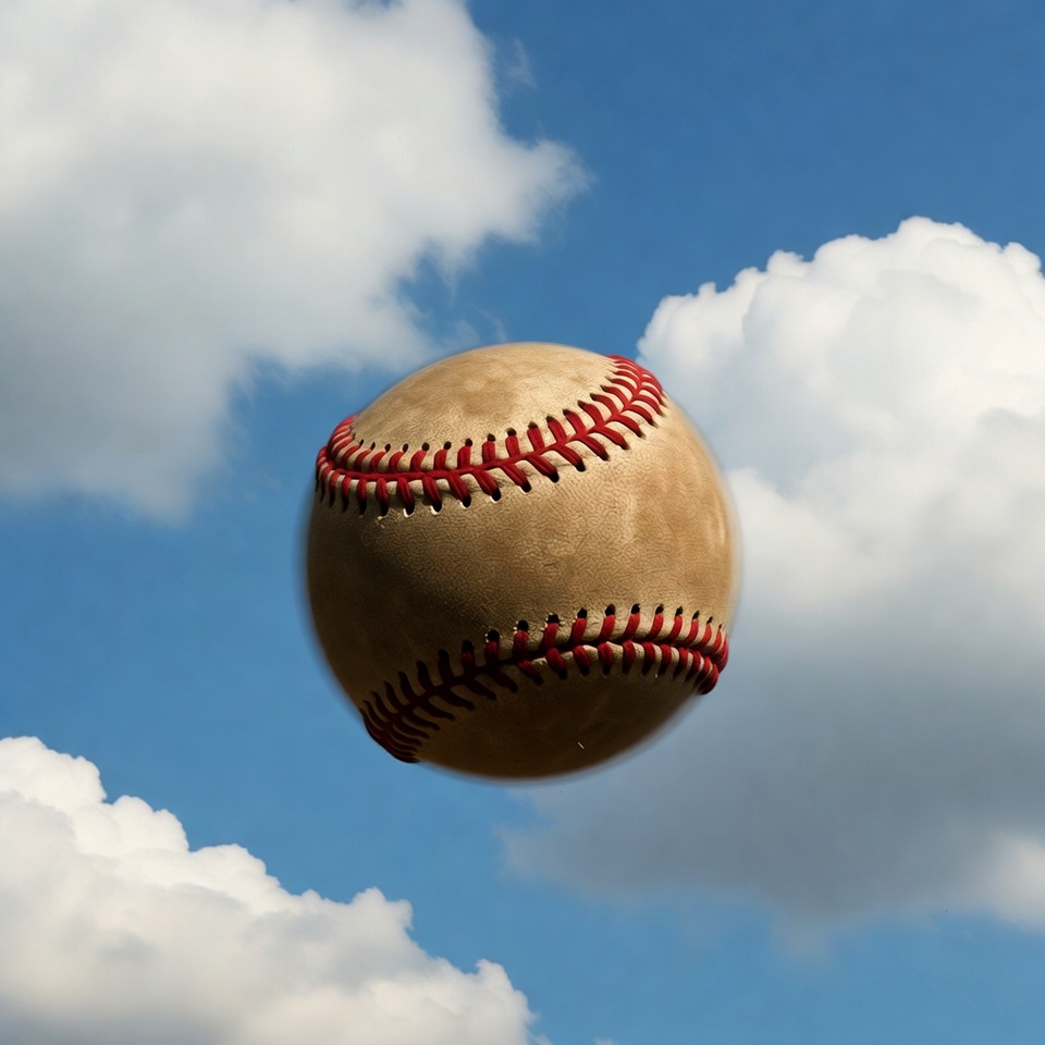 A tan baseball with red stitches floats against a bright blue sky dotted with white clouds. The ball appears in motion, captured mid-air with a slight blur. The seams and leather texture are clearly visible.