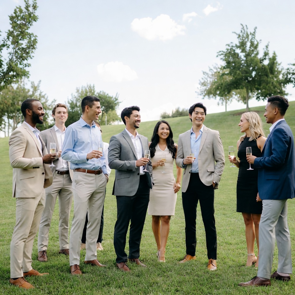 A diverse group of eight professionals, including men and women of African-American, White, Asian, and Latino ethnicities, stands on green grass holding wine glasses. They wear suits, blazers, and dresses in neutral colors like beige, gray, blue, and black. Tall trees and a blue sky with clouds form the background.