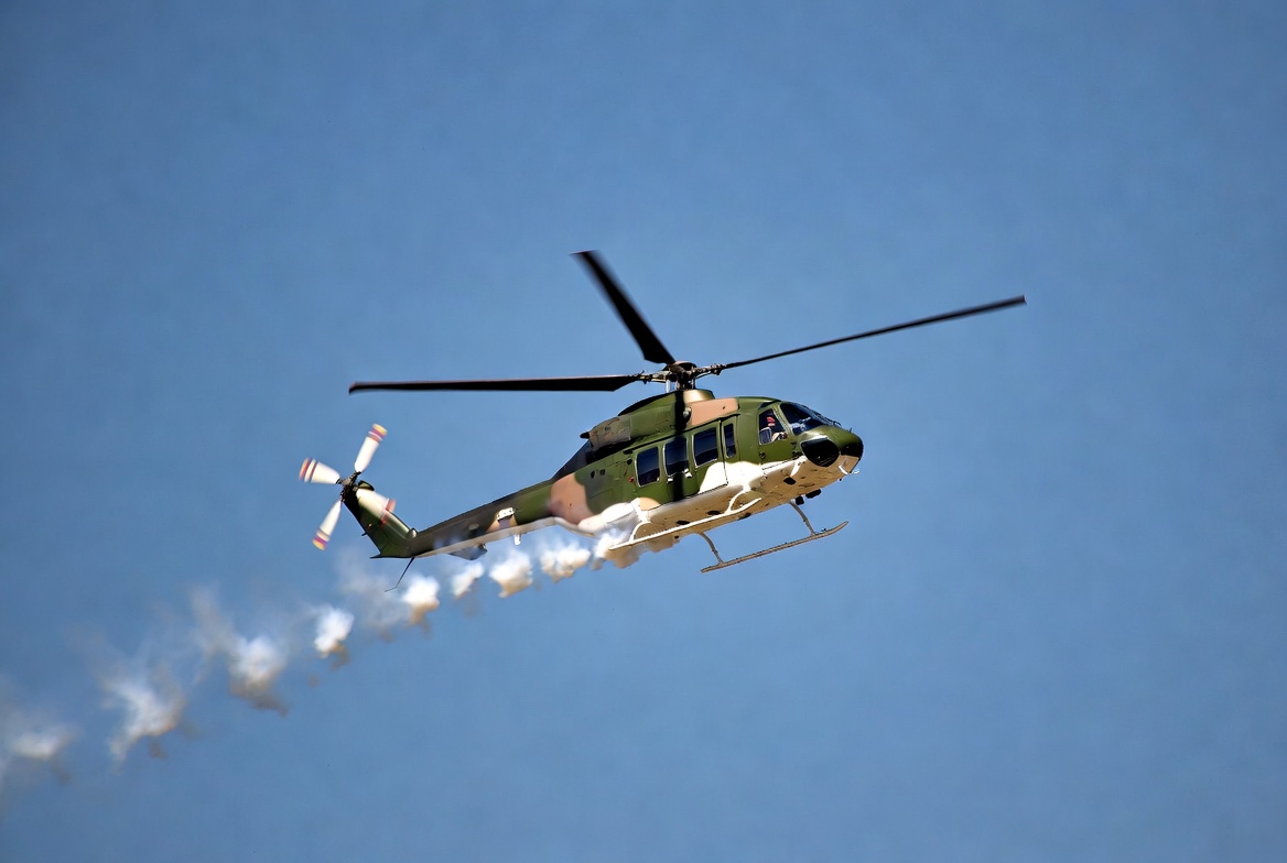 Camouflaged Helicopter Flying with Smoke Trail