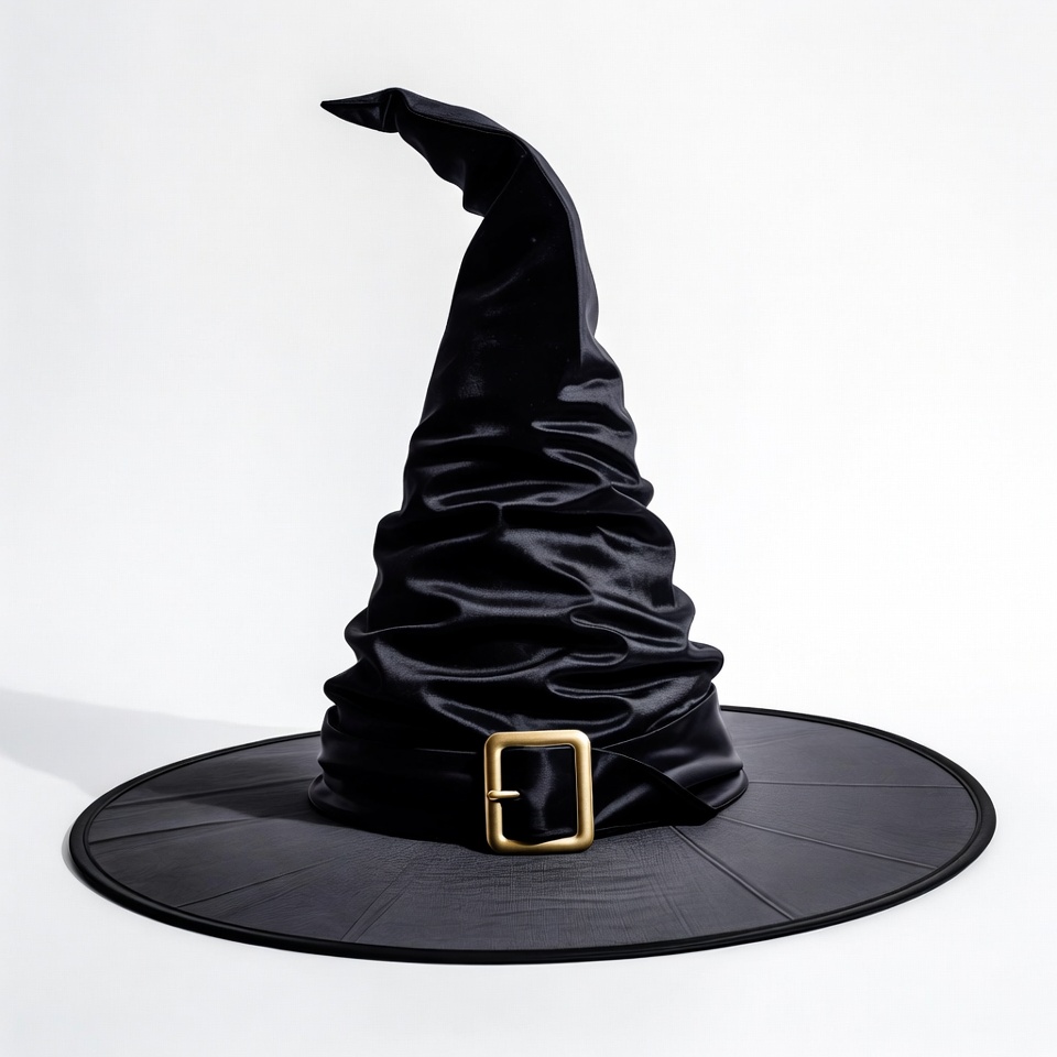 Halloween costume, Halloween hat, black hat, clipart, costume accessory, gold buckle, isolated background, magic hat, pointed hat, satin hat, shiny hat, wide brim, wrinkled texture, witch hat
