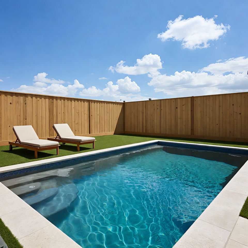 artificial grass, backyard pool, blue sky, blue water, fenced yard, grass lawn, lounge chairs, outdoor pool, pool chairs, poolside chairs, residential pool, small pool, sunny day, tiled deck, white clouds, wooden deck chairs, wooden fence, swimming pool