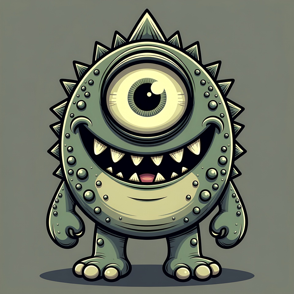 A cute cartoon monster with green skin and a single large eye stands on short legs. It has sharp spikes on its head, bumpy texture on its body, and a wide grinning mouth revealing sharp teeth. The illustration features a bold, hand-drawn style on an isolated background.